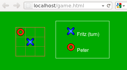 For the game we use a green background, until we have some nice grass sprites covering the ground later. Then we create img-Tags to load the game board and tokens. We use CSS positing to place the tokens at the correct positions on top of the game board: